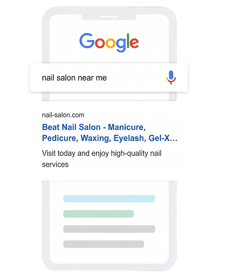 When someone searches “nail salon near me,” your salon shows up first. We optimize and manage your Google Business Profile so you dominate local search results with 5-star reviews and maximum visibility.